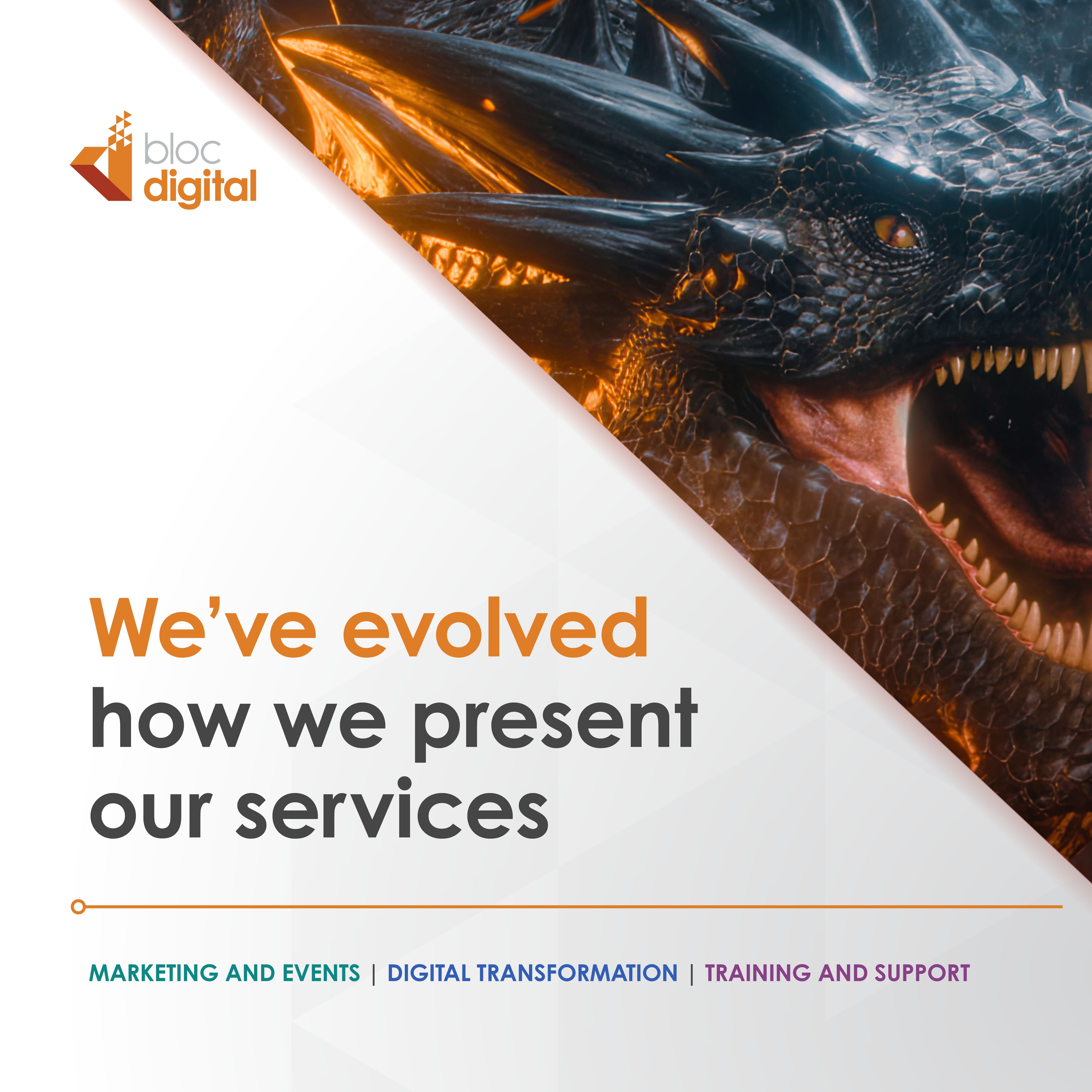 We’ve restructured our offering into three powerful and defined service groups: Marketing and Events, Digital Transformation, and Training and Support. Each represents a core strength of Bloc, as well as the way organisations want to engage with digital creativity and technology today.